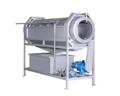 單機由機架、傳動電機、傳動罩殼、滾筒、噴淋管、集水槽、高壓噴嘴等部件組成。其中滾筒為其主要結(jié)構(gòu),與水平呈3°~5°傾斜角放置,工作時由減速機驅(qū)動滾筒轉(zhuǎn)動。果蔬原料通過輸送機均勻地進入滾筒,滾筒內(nèi)有不銹鋼管條形排列成圓形,在滾筒內(nèi)部設(shè)有四個階梯制成的多角形,由于滾筒的轉(zhuǎn)動使物料不斷地翻轉(zhuǎn),物料與滾筒表面以及物料與物料表面相互產(chǎn)生摩擦,在滾筒上方安裝了高壓噴淋管,物料翻轉(zhuǎn)的同時噴淋管噴射高壓水沖洗物料表面,使物料在整個翻轉(zhuǎn)移動的過程中都能受到充分的沖洗。沖洗出的污水由集水槽收集后排出。物料在清洗過程中,由于滾筒的傾斜,受重力作用從高向低處緩慢移動, 后從出料口排出。