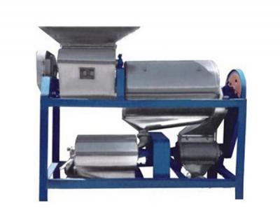 石榴榨汁機結(jié)構(gòu):該機主要由料斗、上粉碎裝置、下破碎裝置、旋轉(zhuǎn)篩、攪拌軸、螺桿泵、機架等組成。除傳動部分外,本機采用全不銹鋼制造。攪拌軸采用變頻調(diào)速。工作原理:石榴從料斗進(jìn)入上粉碎裝置,上部破碎裝置按下石榴開,兩輥之間的間隙為20 mm,然后進(jìn)入下粉碎裝置。下部粉碎裝置再次擠壓石榴,兩輥之間的間隙為10 mm,兩階段擠壓后的石榴籽基本與皮籽分離,并落入分離裝置。在攪拌軸的攪拌下,石榴種子從篩孔脫落,石榴皮從尾部排出,上下壓輥為彈性結(jié)構(gòu)。間隙是可調(diào)的。